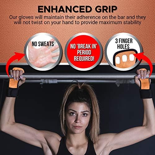✭ ENHANCED GRIP ✭ Our lifting gloves will maintain their adherence on the bar and will prevent your hands from sweating. No ‘break in’ period required! The 3 finger holes give these gymnastic grips maximum stability and prevent it from twisting on your hand